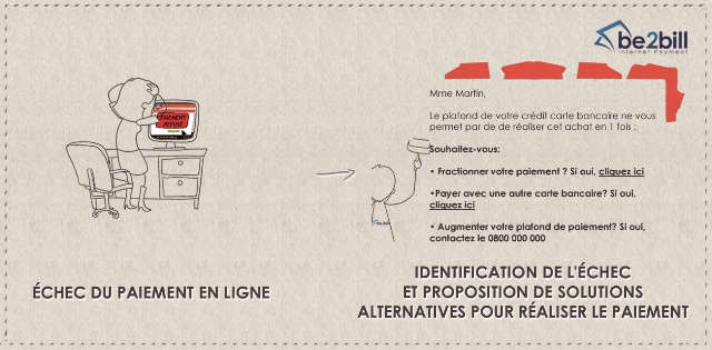 Be2bill offre ainsi aux marchands la possibilité d’envoyer un email² de manière nominative et ciblée à tous les cyber-acheteurs qui auraient décidé de suspendre le paiement ou qui auraient rencontré une difficulté, quel qu’en soit le motif (délai d’affichage trop long, rupture ergonomique ou graphique, échec de l’exécution des paiements, etc.), et sans pour autant les obliger à s’inscrire ou à s’identifier (login) sur le site commerçant.