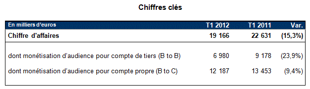 L’activité de monétisation d’audience pour compte propre (BtoC) affiche un chiffre d’affaires en repli de 9,4% par rapport au premier trimestre de 2011, qui constituait une base de comparaison exigeante (+13% par rapport à la même période de 2010).