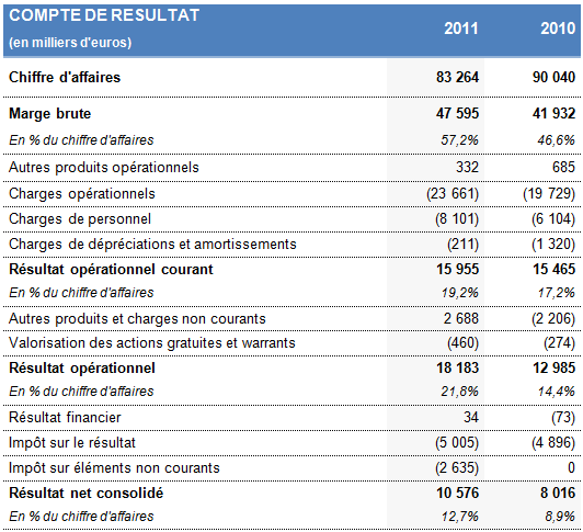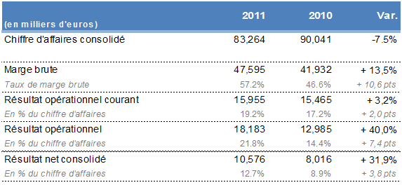 Au cours de l’exercice 2011, la marge brute du Groupe a progressé de 13,5% à 47,6 M€. Elle représente 57,2% du chiffre d’affaires et une progression de 10,6 points par rapport au taux de marge de 2010.