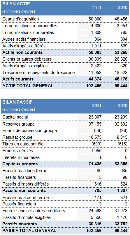 Le bilan du Groupe est solide, sans endettement à court et long terme. Les capitaux propres du Groupe s’élèvent à 71,4 M€ au 31 décembre 2011 vs 63,4 M€ fin décembre 2010.