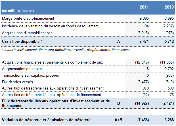 Le free cash-flow du Groupe s’élève à 7,5 M€ en 2011 vs 5,7 M€ en 2010. Cette amélioration traduit l’effort des équipes porté sur la génération de cash avec en particulier une amélioration significative (+1,1M€) de la gestion du besoin en fonds de roulement. Les investissements liés au développement de l’activité Paiements s’élèvent à 2,2 M€.